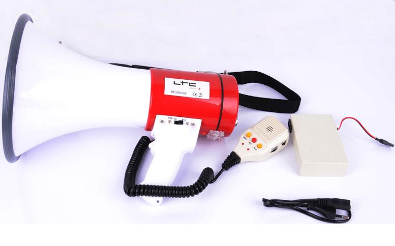 Profesjonalny megafon LTC MEGA50USB z MP3 i syreną - oryginalny megafon belgijskiej marki LTC. Odporny na warunki atmosferyczne głośnik tubowy, megafon PA, wyposażony dodatkowo we wbudowany odtwarzacz MP3 z wejściem USB/SD oraz mikrofon na skręcanym przewodzie. Urządzenie zostało wykonane z wytrzymałego tworzywa ABS i posiada funkcję syreny oraz uchwyt i pasek. Ponadto posiada niewielką, wewnętrzną pamięć, która umożliwia nagranie 16 sec. komunikatów. Wyposażony został w akumulator/baterię wielokrotnego ładowania.