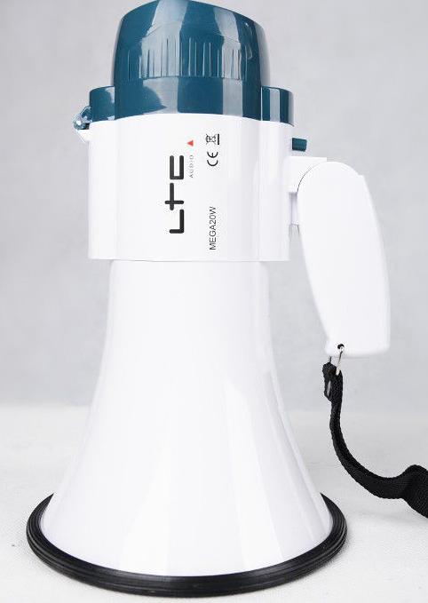 Głośny i wydajny megafon 20W marki LTC - z wbudowanym akumulatorem-baterią, można go używać również z tradycyjnymi bateriami. Dołączona do kompletu specjalna bateria pozwala na natychmiastowe uruchomienie urządzenia, zaraz po wyjęciu z pudełka. Baterię - po wyczerpaniu - można ponownie naładować z sieci 230V (dołączony jest specjalna przejściówka do ładowania). Megafon posiada wbudowaną pamięć 8 sekund, która pozwala na nagranie dowolnej muzyki lub np. tekstu (za pomocą wbudowanego mikrofonu) i potem odtwarzania tego nagrania za pomocą przycisku. Megafon posiada również syrenę, którą można uruchomić innym przyciskiem (taką jak syrena policyjna).